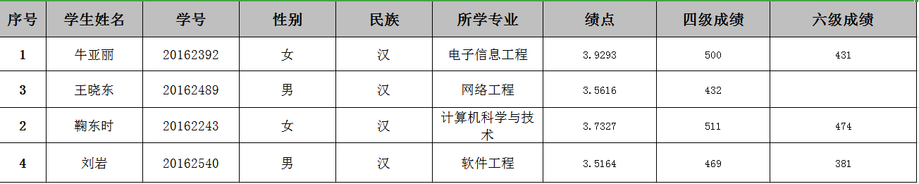 根据《教育部办公厅关于做好2020年推荐优秀应届本科毕业生免试攻读研究生工作的通知》、《BETVLCTOR伟德中文2020年推荐优秀应届本科毕业生免试攻读硕士学位研究生工作方案》和《bevictor伟德国际1946研究生推免遴选工作实施细则(试行)》文件精神,经学生本人申请,学院推免工作小组评选,现拟推荐牛亚丽等4名学生免试攻读硕士学位研究生,名单予以公示如下: