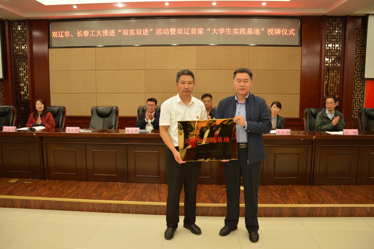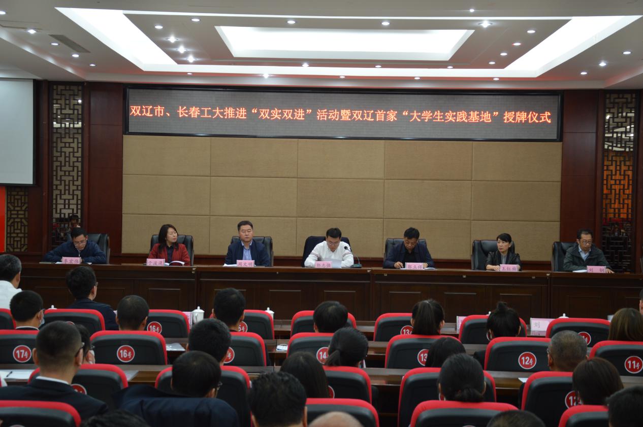 (通讯员:宁静峰)为深化校地合作,引导和激励广大青年学生深入社会,服务吉林省地方经济建设,搭建校地合作服务平台。9月25日上午,在双辽市经济开发区举行计算科学与工程学院、双辽市推进“双实双进”项目“大学生实践基地授牌仪式”活动、送马列党课活动、项目推进座谈活动,双辽市副市长郭志强、组织部副部长王东明、政数局局长王建、我校党委组织部部长郭立祥、计算机学院党委书记周文明、院长王红梅、副院长刘钢、党委副书记季宏伟、马克思主义学院副院长于浚湜、软件工程系党支部书记宁静峰、谷钰老师及部分学生代表参加了活动,活动由双辽市委组织部副部长王东明主持。