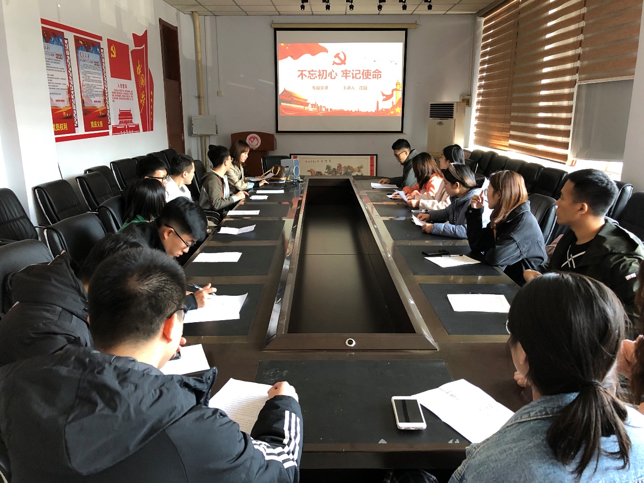会上,支部书记庄园所讲党课的主题是《不忘初心,牢记使命——深刻理解党的性质宗旨》,她结合中国历史、中国共产党党史、十九大精神,围绕“不忘初心,牢记使命”这一主题,从中国现代化进程与中国共产党的性质宗旨、中华民族伟大复兴与中国共产党的性质宗旨、做合格党员与中国共产党的性质宗旨等三个方面做了深刻阐述。她强调,作为共产党员要始终不忘心怀共产主义理想,始终不忘全心全意为人民服务的根本宗旨,始终不忘党的优良传统和作风,立足自身,勤奋刻苦,为中华民族的伟大复兴贡献一份力量。