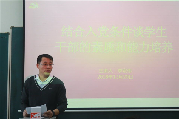 活动伊始,与会老师及全体学员齐唱国歌。学院专职组织员薛勇宣读了培训计划,并强调每一位学员要做到严格要求自己,认真完成学习和考核任务,争取早日成为一名光荣的共产党员。随后,季宏伟老师以结合入党条件谈学生干部的素质和能力培养为题为大家讲授了培训班的第一课。首先提出同学们要端正自己的入党动机,他强调,只有思想上入了党,组织上才能入党,入党不是盲目的跟风,而是自己主观意识的驱动,是对党的崇高敬意和向往。进一步对学员们的素质和能力培养作出要求,通过我院历届优秀学生的成功事例告诫全体学员要树立远大的人生理想和奋斗目标,生活中要做到严于律己、严以修身,学习工作中要珍惜时间,把握机会、争取荣誉,在学院学团工作的各方面要讲奉献,起表率做先锋。