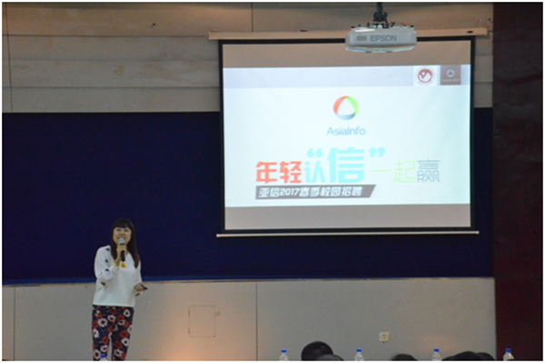 本次宣讲的目的是让同学了解亚信集团,经过双向选择后选拔出优秀学子到企业实习、就业。林丹经理首先介绍了亚信集团的创立背景、企业文化、主营业务、主要客户等企业相关信息,然后介绍了企业为学生提供的职业发展规划、未来的工薪待遇以及实习生在公司享有的权利和义务。在指导同学如何选择工作时,介绍亚信集团今年将面向学院的四个专业提供软件研发、测试、运维等82个岗位,强调“所选岗位是否适合自己是选择工作的重中之重”。会后,同学们通过手机客户端参与了企业的第一轮笔试,面试将在本周六进行。
