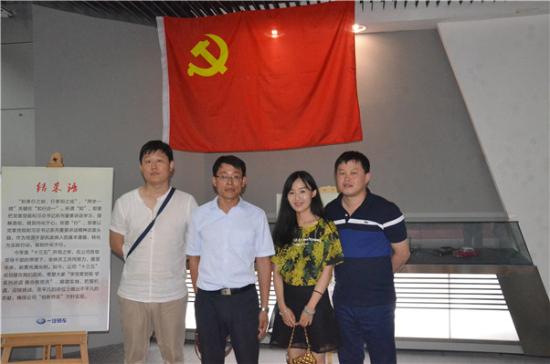 在一汽轿车股份有限公司的红旗文化展馆里,伴随着解说员的讲解,党员们参观了鉴证历史发展的一辆辆展 车,认真了解到了红旗轿车伴随新中国成立以来的成长历程,从第一辆国产轿车的诞生到如今中国独树一帜的民族轿车品牌,饱含了老一辈革命家的忠诚和民族责任感,他们那种自强自立的民族精神深深感染着在场的每一位党员,一汽红旗人艰苦奋斗、为国争光,以民族为己任,展国家之风采的爱国主义情怀也值得党员们学习。