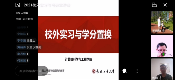 新闻网讯(通讯员 万瑞雪)为了对我院2018级同学进行就业与考研指导,我院于5月21日下午6时在企业微信平台召开2021校外实习暨考研升学宣讲会,本次会议由我院党委副书记季宏伟主持,我院副院长刘钢、副院长郑虹、学院校企合作部主任汤淼、国际教育学院学生党支部书记兼毕业班辅导员李强及我院团委书记兼18级辅导员王珺楠出席本次会议,18级全体同学线上参加本次会议,部分学生代表在计算机楼323观看本次会议。