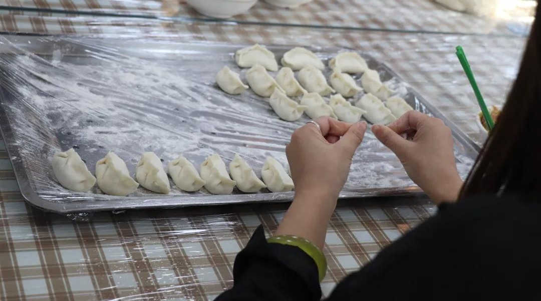 讲话完毕,大家挽起袖子,开始包饺子。老师们分工合作,和面、搓球、擀皮、装馅,各司其职,按部就班,手上的动作行云流水,包出一个个既“高颜值”又饱满的饺子。