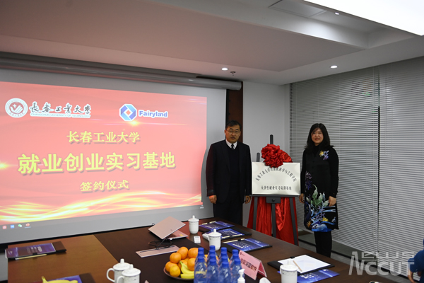 校长张明耀与我院1997级校友、上海复深蓝软件股份有限公司董事、联合创始人兼副总裁靳翠共同为就业创业实习基地揭牌
