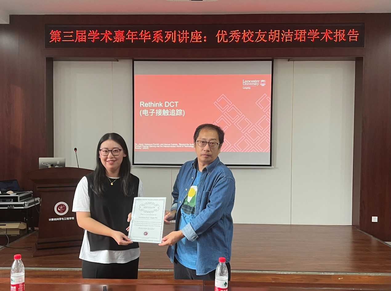 2023年9月24日,bevictor伟德国际1946开展庆祝建院45周年暨第三届“学术嘉年华”系列讲座。本次讲座的特邀嘉宾胡洁珺是我校的优秀校友,目前在兰卡斯特大学莱比锡分校担任助理教授,这也是她第二次回母校做学术报告,主题是“Beyond the Surface of Digital Contact Tracing: Delving into the Interconnected World of Technology, Individuals, and Society”。讲座由副院长鲁慧民主持,学院党委书记周文明、副院长刘钢及相关师生参会。