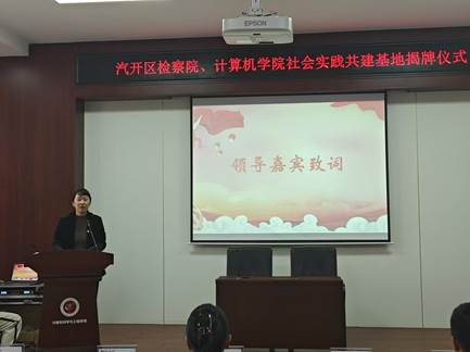 会议最后,计算机学院党委副书记王越为共建基地致辞。她对汽开区检察院在学院人才培养工作中的鼎力支持表示衷心的感谢,并强调,此次合作不仅是高校与检法部门的创新性结合,也是双方共同培养具有法治精神与社会责任感的时代新人的重要举措。