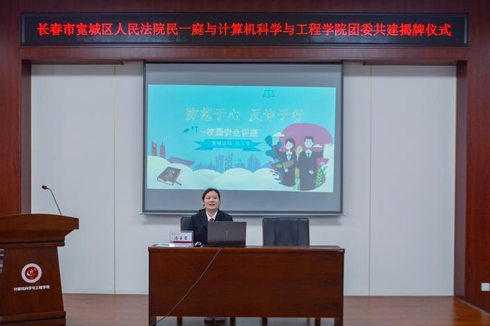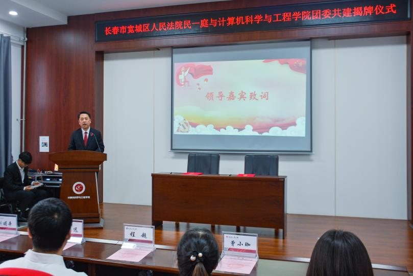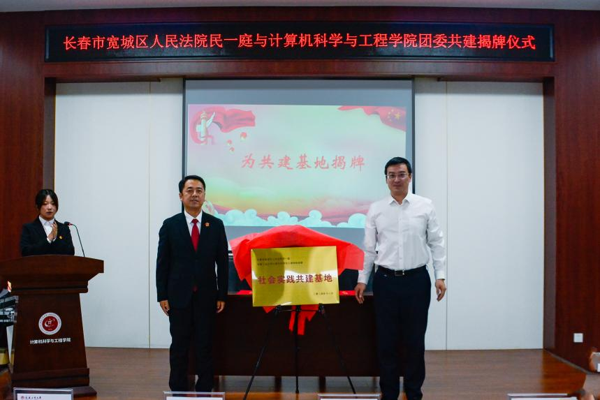 宽城区人民法院民一庭庭长张明远与计算机学院院长程超共同为双方共建基地揭牌。未来,共建双方将以此为契机,互惠合作,在法治教育、专业实践等方面为学生提供优质的教育资源,培养学生法治意识、底线思维,促进平安和谐校园建设。