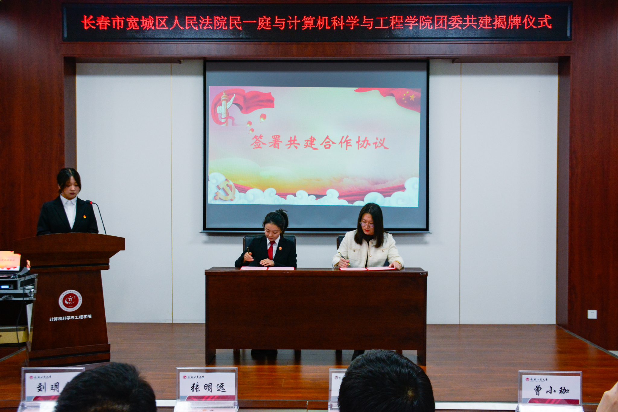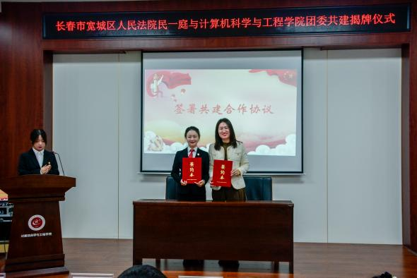 共建活动中,宽城区人民法院民一庭副庭长刘玥辛与计算机学院团委书记刘惠春共同签署共建合作协议,双方合作正式启动。共建协议承载着双方的合作愿景与责任担当,标志着计算机学院与宽城区法院正式携手,踏上协同发展的新征程,也预示着双方将紧密合作,充分整合优势教育资源。