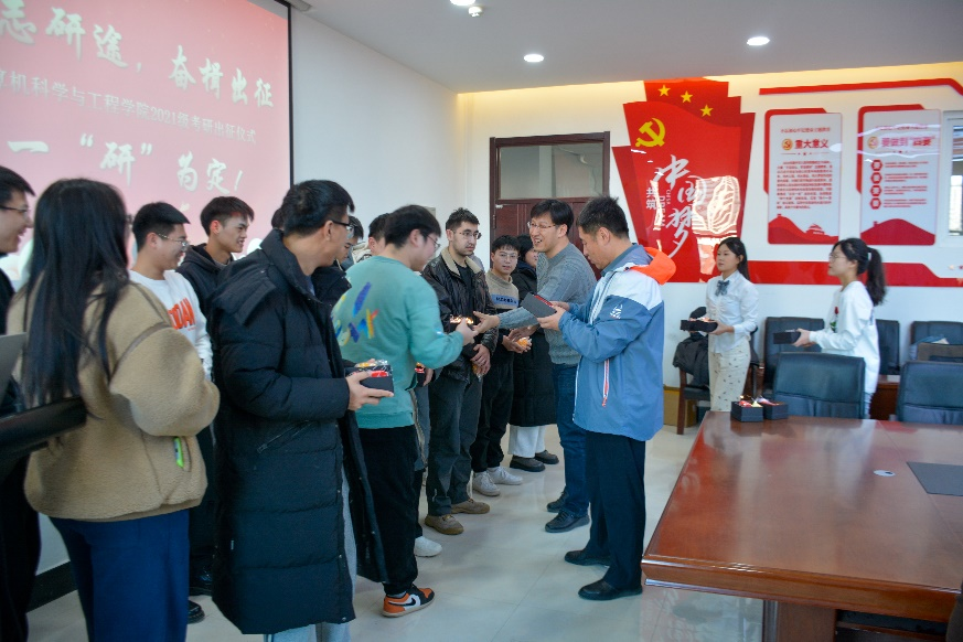 活动第一项,王越副书记、鲁慧民副院长为考研学生代表送上橙子,寓意心想事“橙”,希望同学们在品尝橙子的甘甜时,能坚定心中的信念,收获成功的果实。