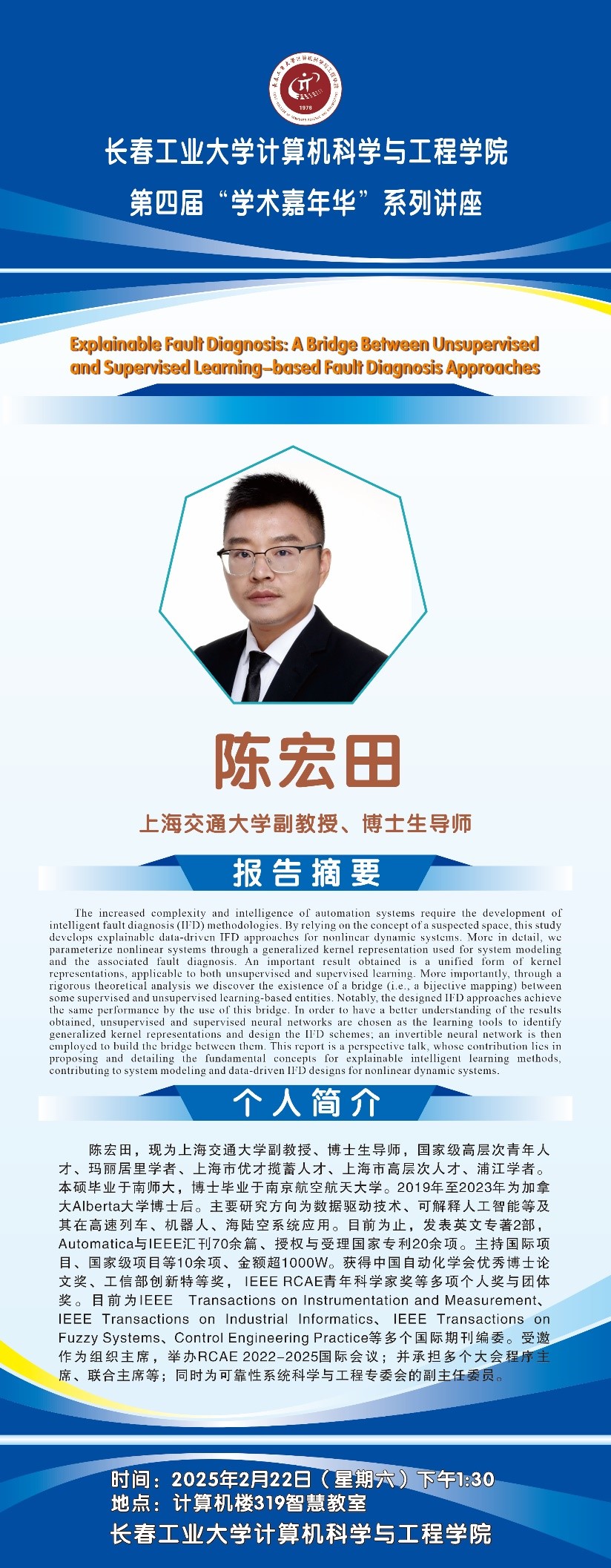 新闻网讯(通讯员 李东洋)学院于2025年2月22日在北湖西区计算机学院323会议室成功举办第四届“学术嘉年华”活动,讲座主题为“数据驱动与可解释人工智能的技术突破及应用实践”。本次讲座由上海交通大学副教授、博士生导师陈宏田主讲。院长程超、副院长鲁慧民、学院青年教师和研究生参加了本次专题讲座。