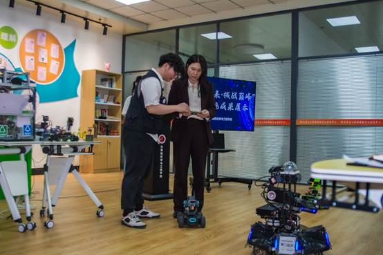 1024创新实验室达摩克里斯战队与行者实验室作为学院科创团队的代表,展示了多项国家级赛事获奖成果。达摩克里斯战队以动态演示形式呈现了其核心成果——哨兵机器人,该机器人凭借卓越的感知决策能力和智能控制技术,在第二十四届全国大学生机器人大赛RoboMaster机甲大师高校联盟赛中斩获国家级二等奖。团队成员李伟豪、刘泽文通过现场操作与讲解,生动诠释了团队在人工智能领域的技术突破。