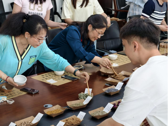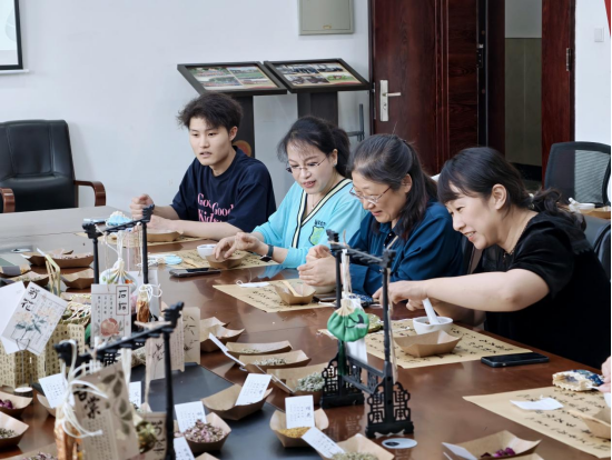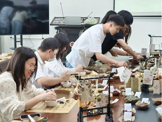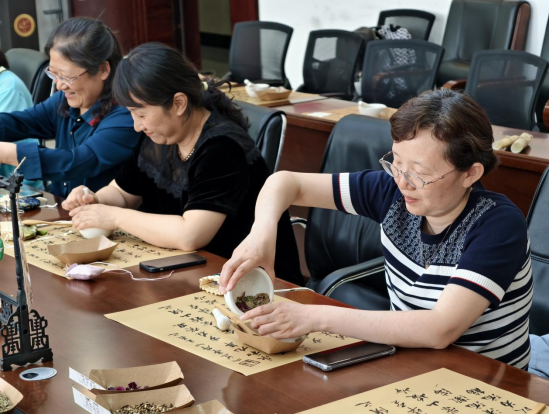 活动现场,学院为教职工准备了艾草、薰衣草等香料,以及各类制作香囊所需的材料。老师们认真学习了香囊的制作方法,并亲手完成填充、装饰等步骤。大家相互交流制作技巧,现场气氛融洽。