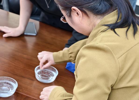 清碗盛露,纤针映光,一场指尖与水的温柔邂逅悄然开启。一分钟的时光里,每一次抬手、每一次投掷,都是耐心与巧劲的完美融合。针尖轻触水面,若能挣脱重力的束缚,将缝衣针摆成三角形,那就是成功。老师们在水与针的低语中,感受传统民俗乞巧的雅致与趣味。