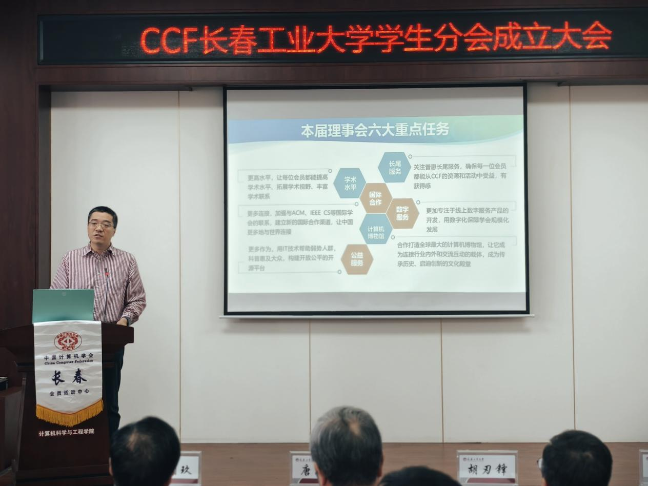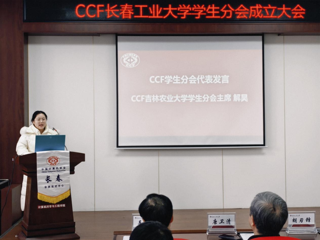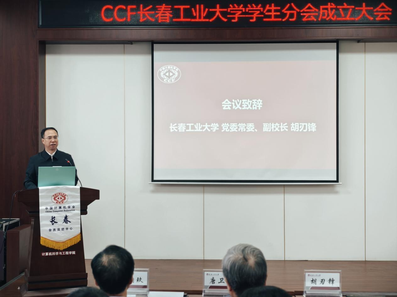 大会严格依照议程有序推进。胡刃锋副校长首先致辞,对分会成立表示祝贺,强调分会要立足学校计算机学科发展实际,搭建学术交流与实践创新平台,助力学生成长成才。CCF长春分部主席车翔玖教授代表组委会致辞,阐释了CCF学生分会的建设宗旨与发展方向;CCF会员与分部工委主任李贝则详细介绍了CCF的发展历程、组织架构与服务体系,为分会后续运作提供了专业指导。