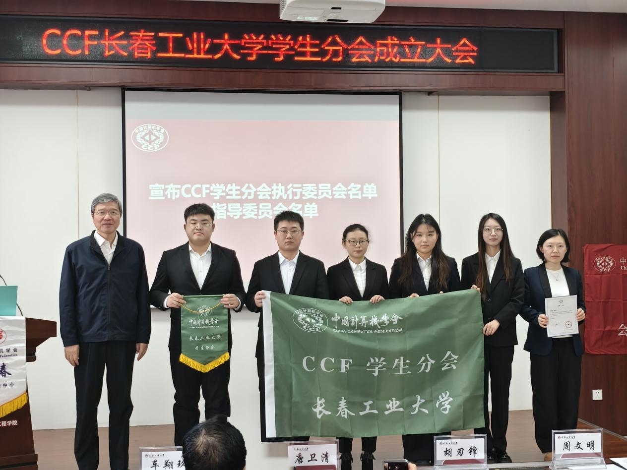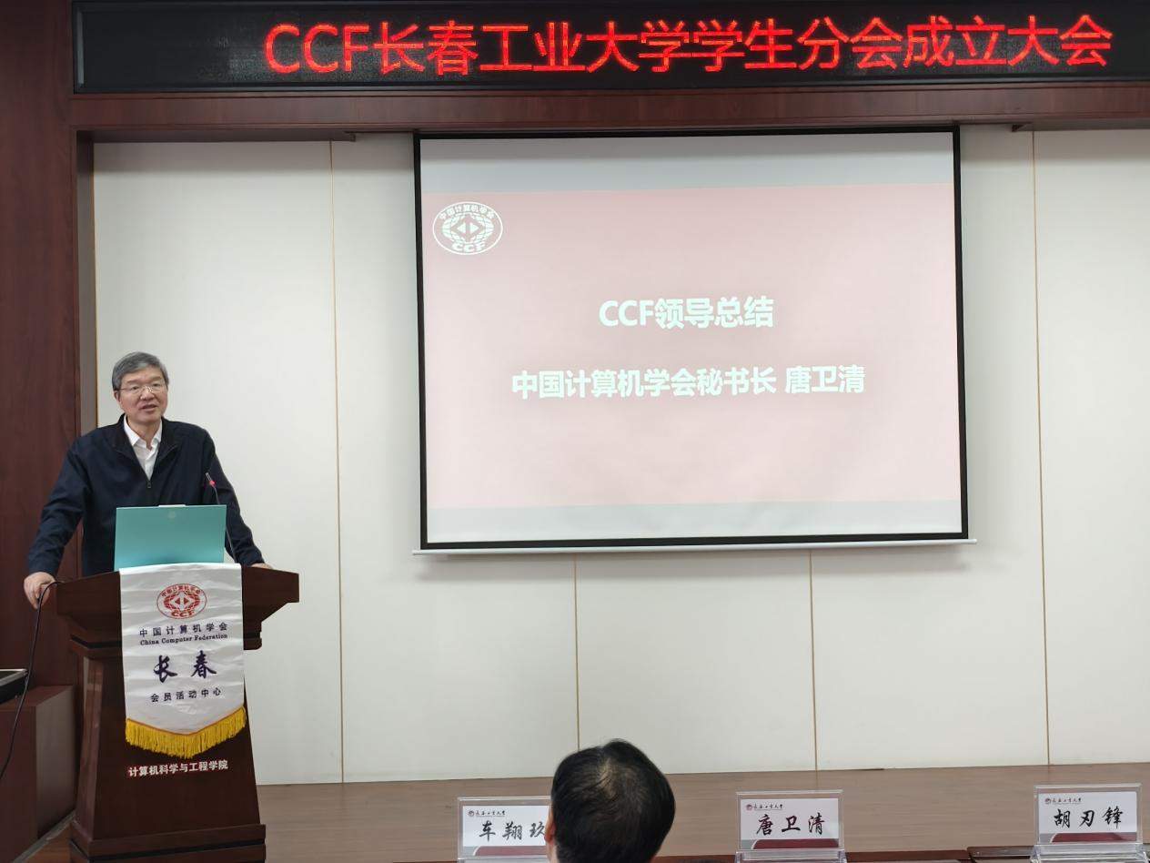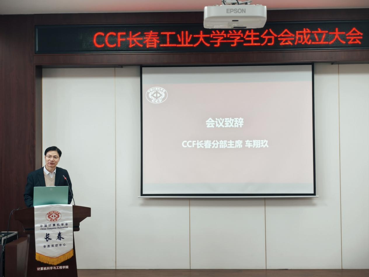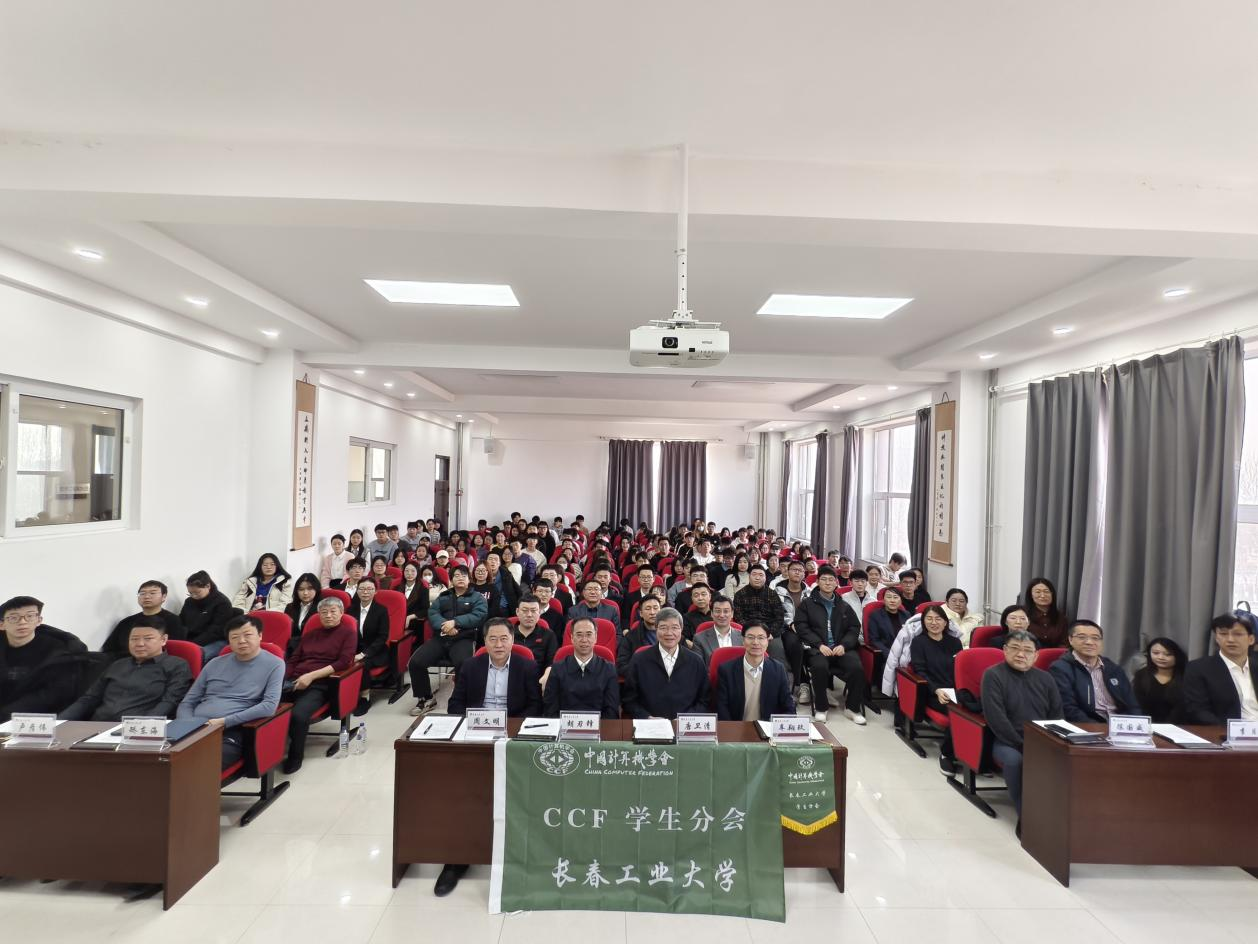 大会严格依照议程有序推进。胡刃锋副校长首先致辞,对分会成立表示祝贺,强调分会要立足学校计算机学科发展实际,搭建学术交流与实践创新平台,助力学生成长成才。CCF长春分部主席车翔玖教授代表组委会致辞,阐释了CCF学生分会的建设宗旨与发展方向;CCF会员与分部工委主任李贝则详细介绍了CCF的发展历程、组织架构与服务体系,为分会后续运作提供了专业指导。