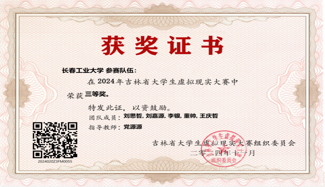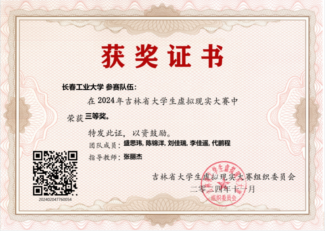 本网讯(通讯员 盛思玮)2024年10月20日,由吉林省教育厅、吉林省文化和旅游厅指导的吉林省“研究生/大学生虚拟现实大赛”决赛在长春大学成功举办,我院学生团队表现优异,共斩获省级一等奖1项、省级三等奖2项,充分展现了我院学生在虚拟现实创意设计与技术实现方面的卓越能力与团队协作精神。