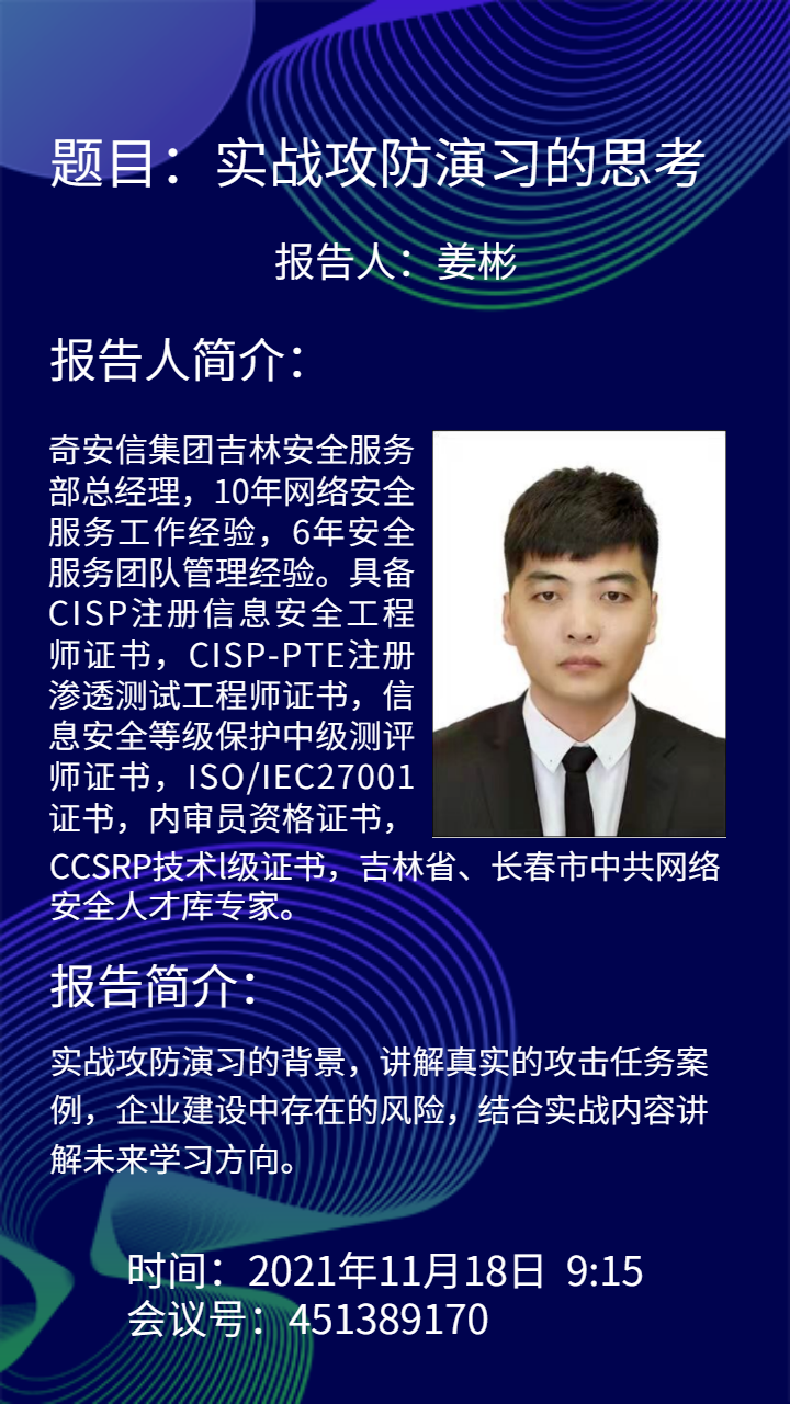 “风云讲坛”——实战攻防演习的思考 主讲人:姜彬 时间:2021年11月18日 9:15 腾讯会议号:451389170 |